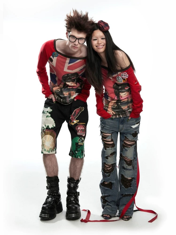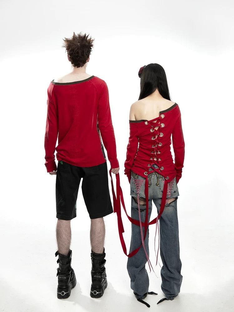 Fruitanari printed one-shoulder tie-up long-sleeve top