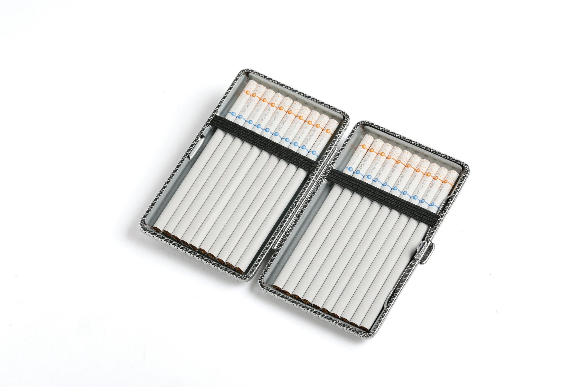 Press the side button to open the box. The leather strap inside can hold cigarettes securely, or it can be used to store coins or cards.